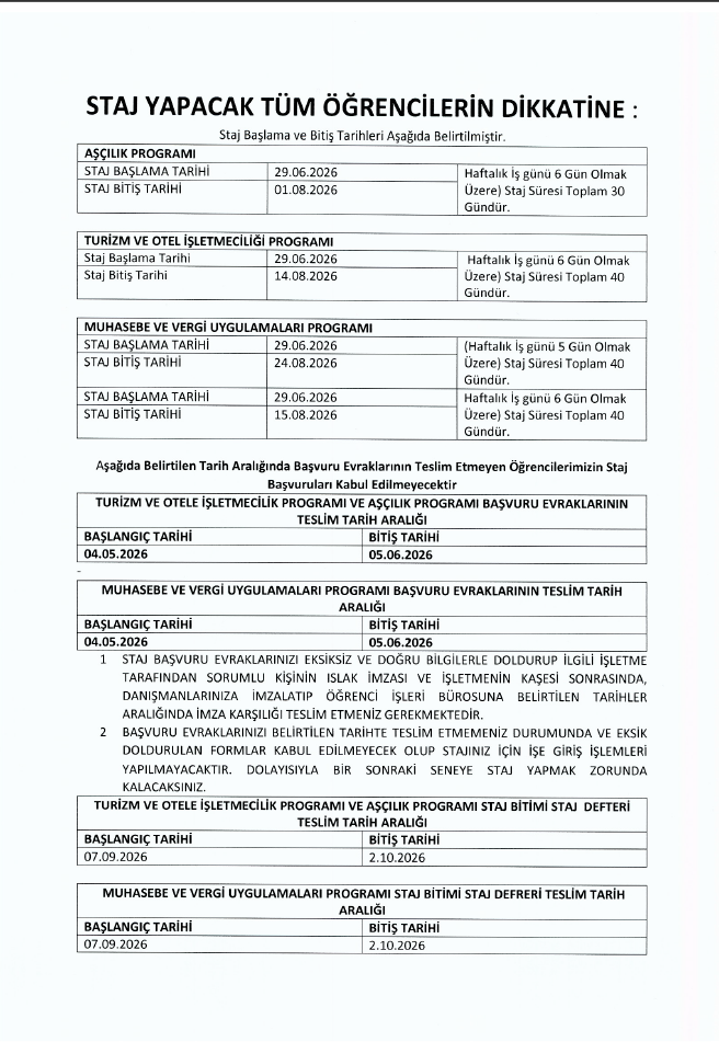 Staj Yapacak Öğrencilerimizin Dikkatine